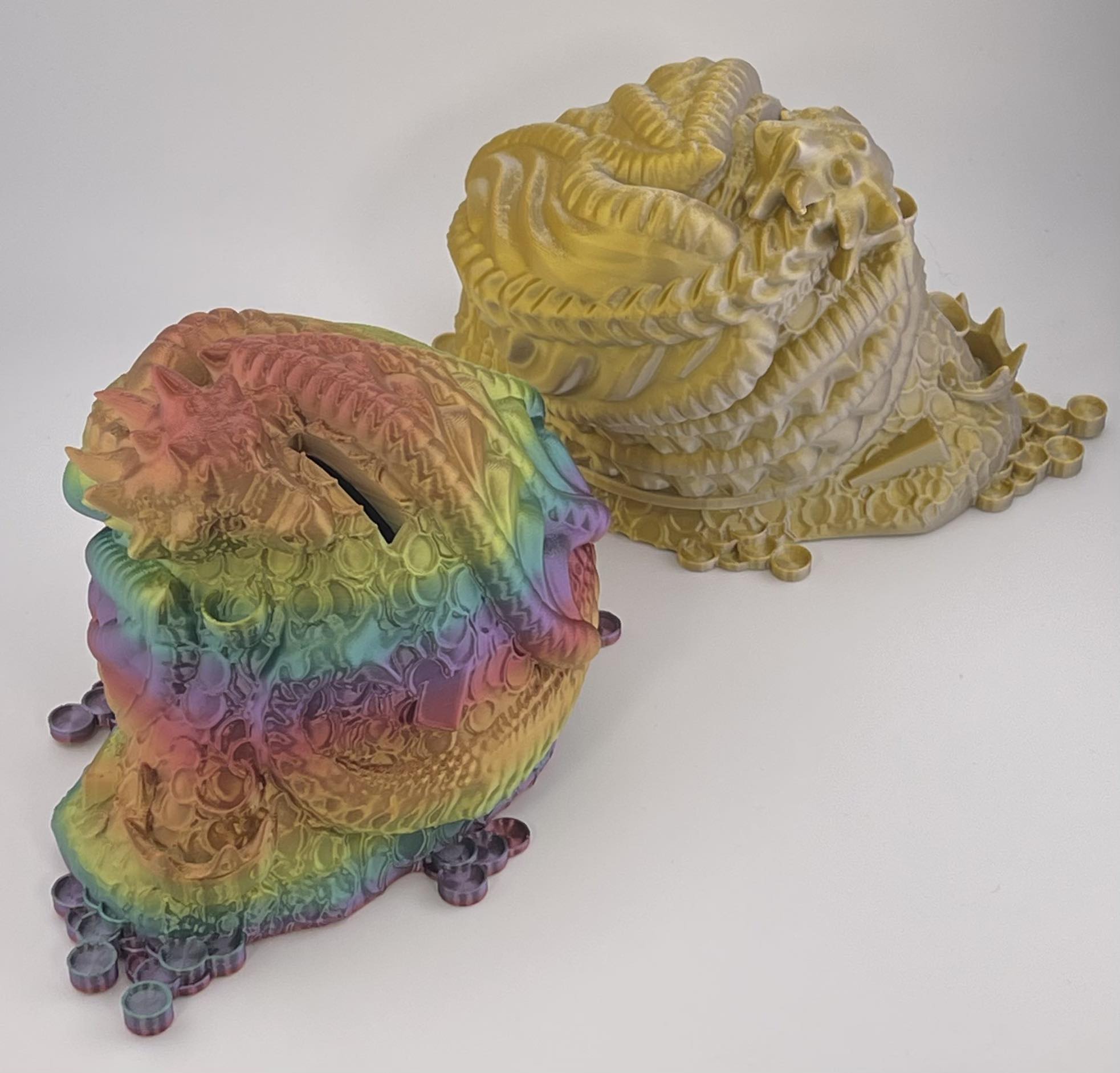DRAGON BANK Approximately 7 inches across featuring a dragon wrapped around his hoard of gold. Slot in the top with a screw plug in the bottom.